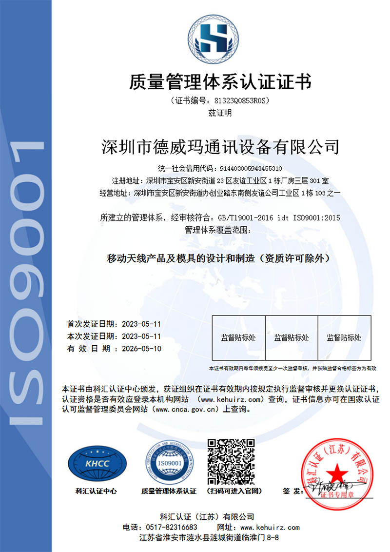 深圳市德威瑪通訊設備有限公司,成立于2011年,是一家集研發、制造、銷售為一體的中外合資企業.現有員工200多人。公司擁有雄厚的技術人員,先進的進口檢測設備,在吸收國內外優秀經驗的同時不斷開發新產品。企業總部立足于科技創新城市--深圳,攜手北京和上海的天線研發中心,面向國內外客戶,公司產品涉及軍工、民用的各類無線電子產品,是率先從事移動天線定制服務的少數企業之一,企業提供自主研發的DWM品牌天線產品及相關的技術解決方案。公司引入ETS三維暗室測試系統2套(含5G暗室),并引進ETS之TRP、TIS測試軟件,可進行BT,WIFI,GPS和北斗,GSM、TD、WCDMA,LTE模式下的各項有源和無源測試,另有網絡分析儀,綜合測試儀,頻譜分析儀多臺,為項目提供強有力的技術支持。